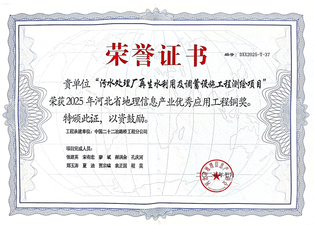 近日獲悉,在河北省地理信息產業協會主辦的權威評選中,路橋公司憑借“污水處理廠再生水利用及調蓄設施工程測繪項目”的卓越實踐,榮獲“2025年河北省地理信息產業優秀應用工程銅獎”。